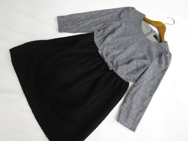 > 美品 ユニバーバルミューズ UNIVERVAL MUSE ひざ丈 七分袖 ラウンドネック ドッキングワンピース グレー杢×ブラック