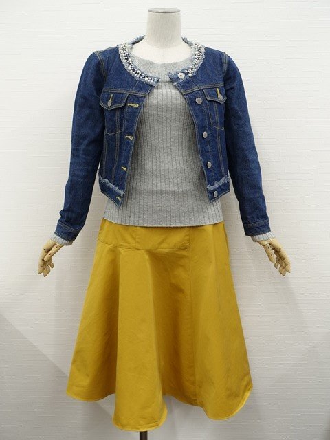 > 美品 INGNI等 デニムジャケット+セーター+ひざ丈ヘムスカート コーディネート3点セット M相当 青/グレー/黄系 フェミニン系 30代~40代
