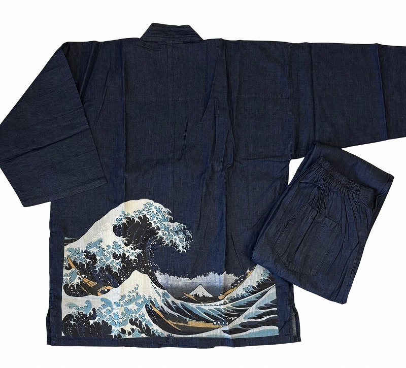 - [江戸てん]L 訳あり 作務衣 4.5オンス薄手デニム生地 綿100% 先染生地の柔らかさ 北斎 波 紺