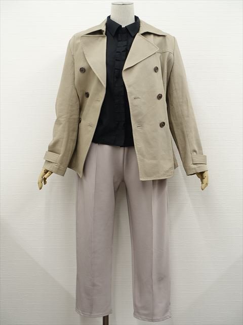 > 美品 Belle Maison等 トレンチコート+ブラウス+テーパードパンツ コーディネート3点セット L相当 ベージュ/黒/グレージュ オフィス系 20代