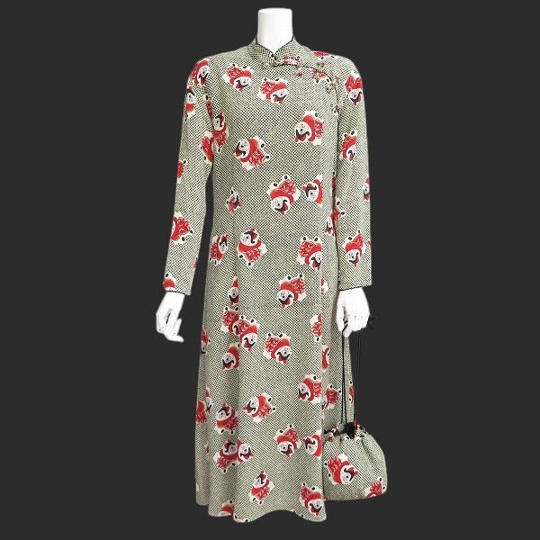 > #au ワンダフルワールド カネコイサオ ワンピース 黒 犬張り子柄 鹿の子 巾着バッグ付き チャイナカラー 縮緬 レア 希少 [970517] k01