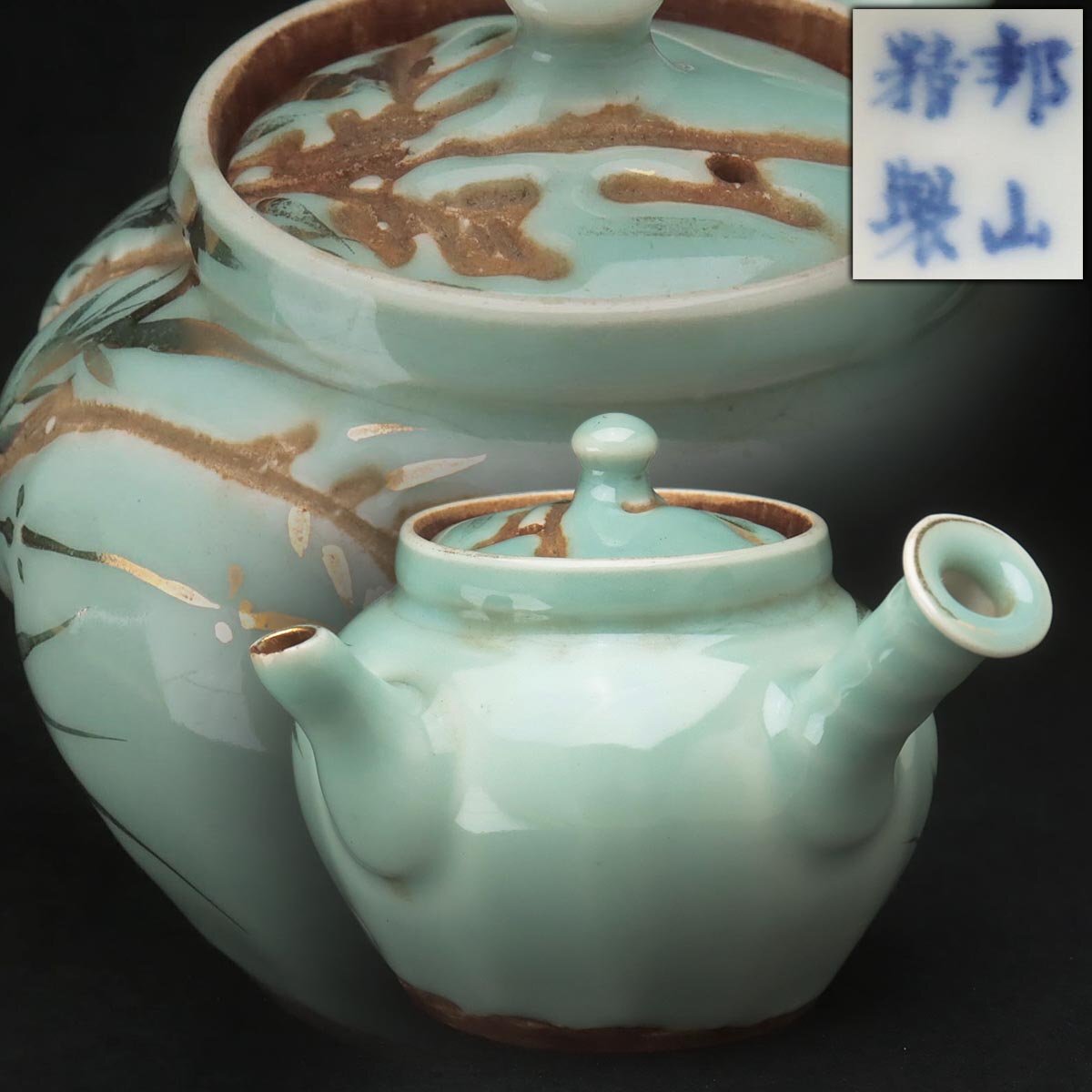 - FD118 時代煎茶道具【邦山精製】京焼 青磁金彩 竹彫文 横手急須 幅11cm・青瓷金彩竹紋茶注 茶器 茶具 古美術