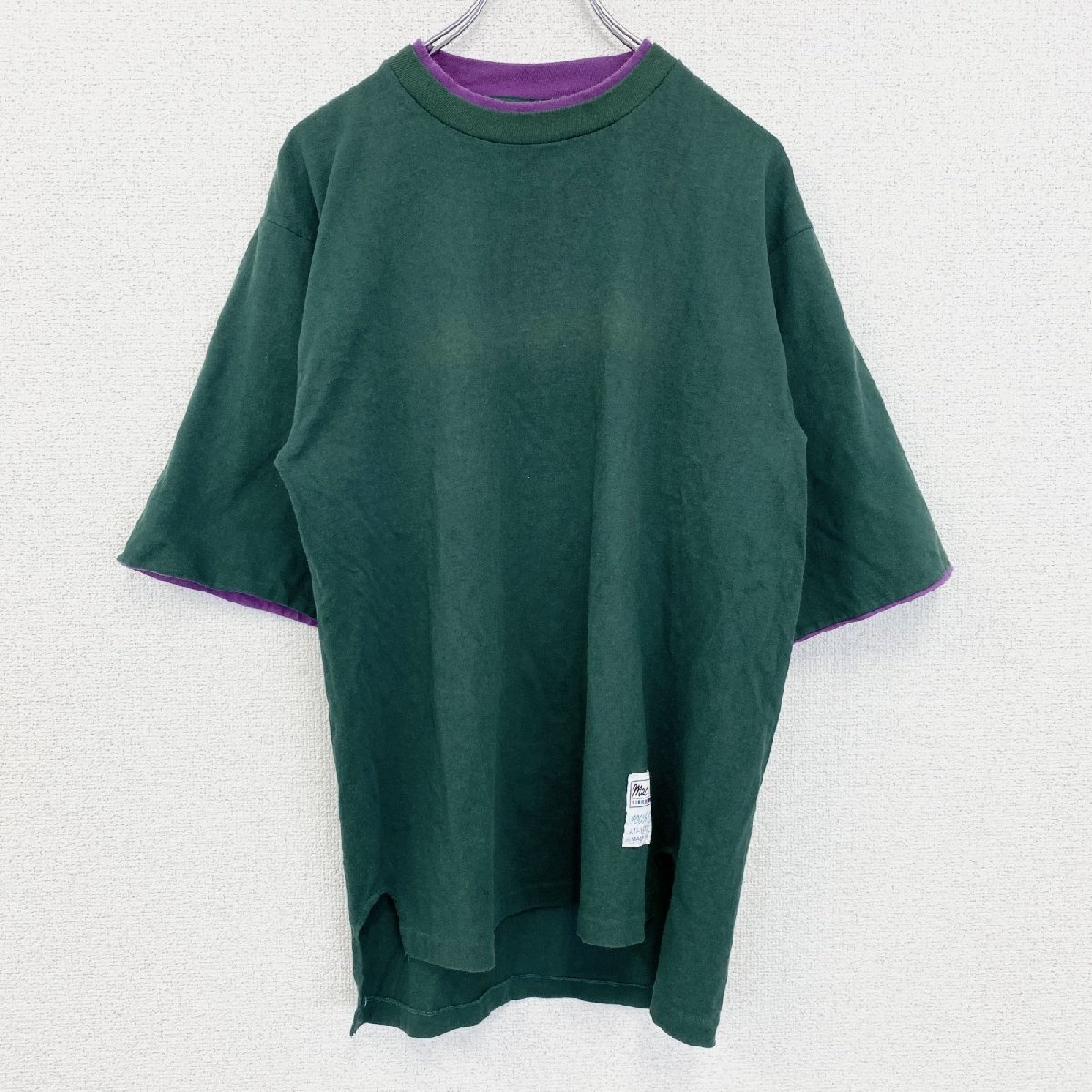 > 古着 used 半袖レイヤードTシャツ グリーン パープル 切り替え ワンポイント クルーネック USA製 Lサイズ