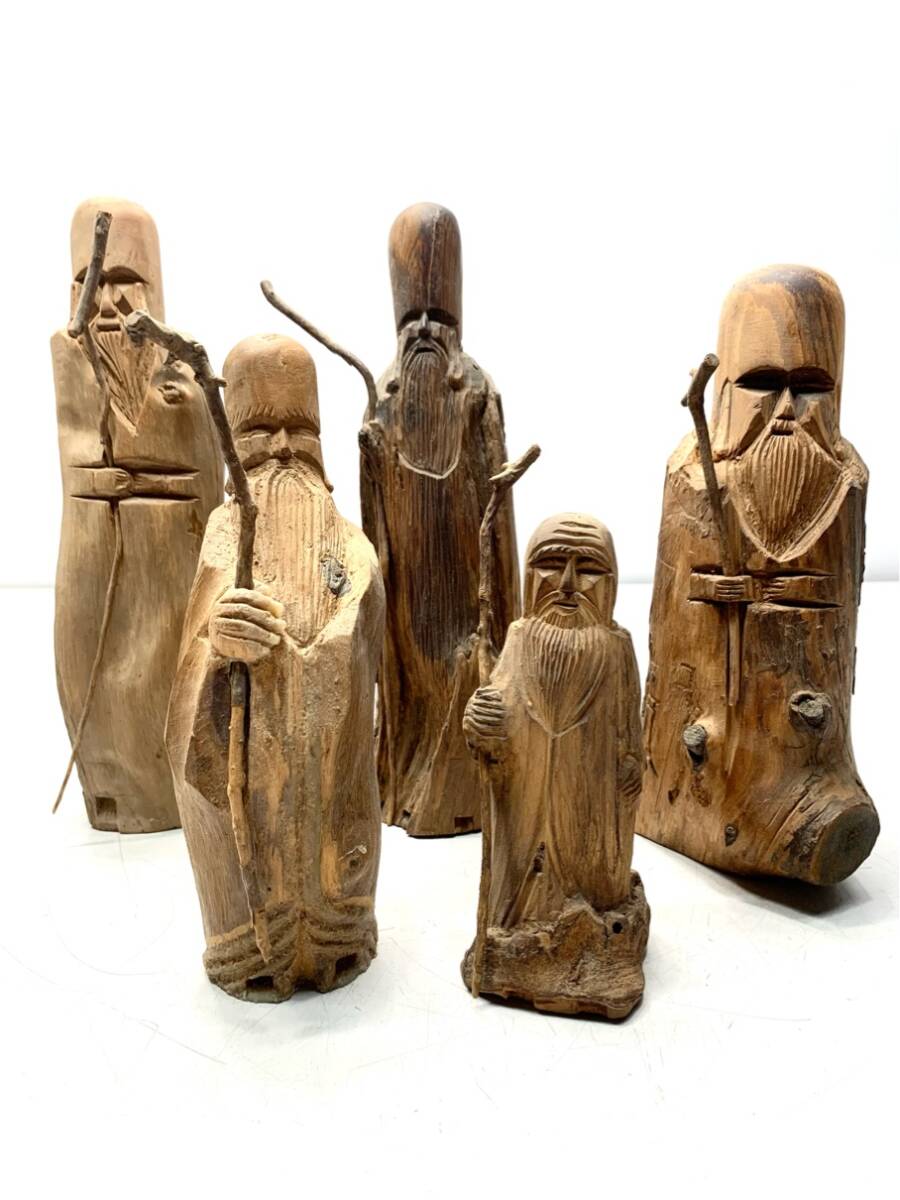 - 貴重 寿老人 木彫り人形 まとめ売り 5体 福禄寿 縁起物 インテリア 切株 天然木 ヴィンテージ レトロ A9715A10