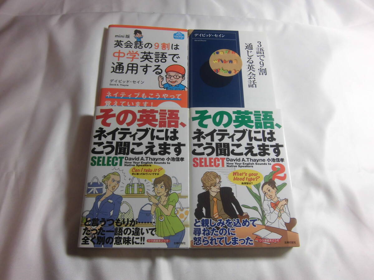 「3語で9割通じる英会話」デイビッドセイン (著), 中野きゆ美 (イラスト) 2008年初版2010年2刷定価730円+税。と「mini版 英会話の9割は中学英語で通用する 」 デイヴィッド セイン (著) 2012年初版2012年12刷定価648円+税。 と「その英語、ネイティブにはこう聞こえますSELECT」 デイヴィッド セイン (著) ,小池 信孝 (著) 2008年初版2008年5刷定価650円+税。と「その英語、ネイティブにはこう聞こえますSELECT 2」 デイヴィッド セイン (著),小池 信孝 (著) 2008年初版定価650円+税。の計4冊セット。