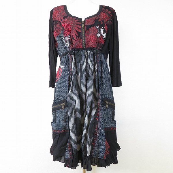 > #a デシグアル Desigual ワンピース 46 黒 赤 グレー系 ミックスパターン 総柄 裾フリル 七分袖 大きいサイズ レディース [957177] k01