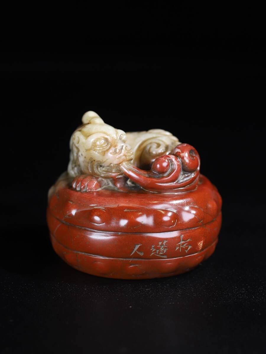 - ◆珍蔵◆中国古美術 清時代 古寿山石彫り瑞獸 印章 箱付 細密細工造 置物 古賞物 骨董品 時代物 A17