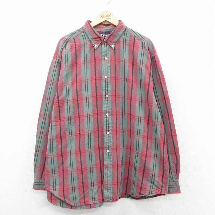 > XL/古着 ラルフローレン 長袖 ブランド シャツ メンズ 90s ワンポイントロゴ BLAKE 大きいサイズ ロング丈 コットン ボタンダウン 緑系他