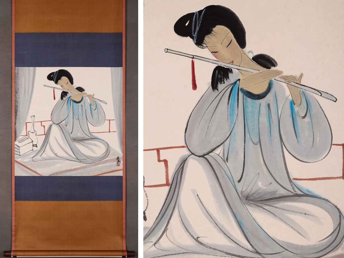 - ▽鴻▽古書道【近時代画家「林風眠書」紙本「吹笛仕女図」】 真筆肉筆 骨董書画 掛け軸 時代物 中国古美術 骨董品