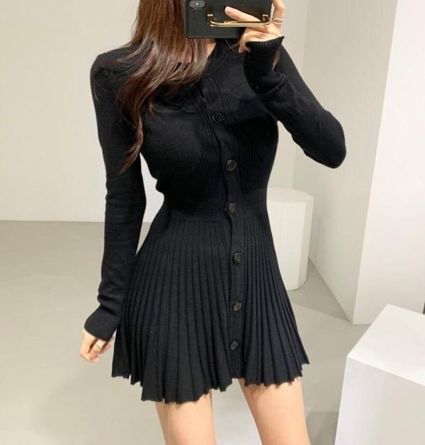 > 秋新品 オシャレ 前開き プリーツスカート sexy★大人 おしゃれ ストレッチ素材★ミニ丈ニットワンピース ★ 黒/Mサイズ