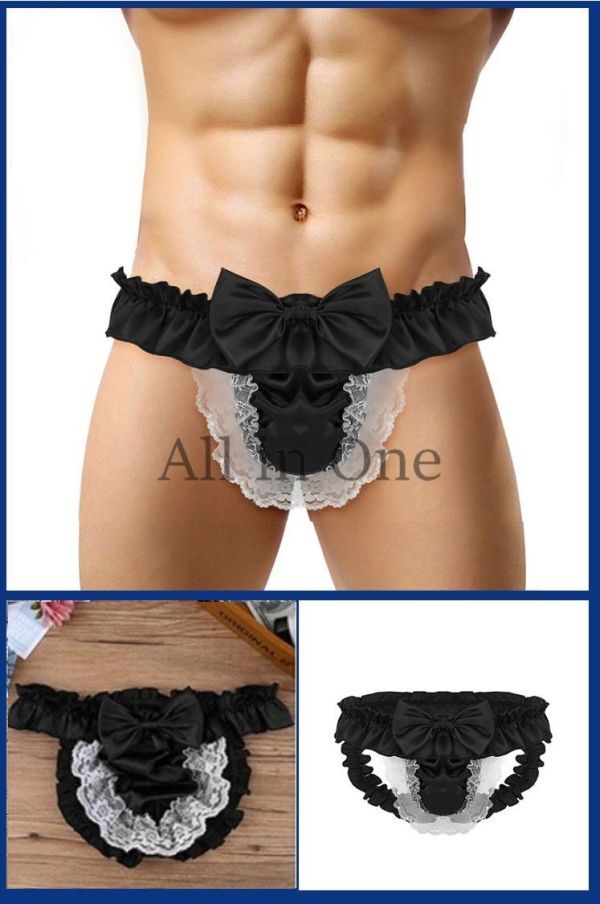 > 180-38-10 メンズ サテン フリル メイド風 ケツ空き Oバック【ブラック,M】男性 下着 セクシー アンダーウェア パンティ ゲイ ショーツ .1