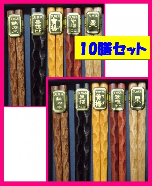 > 【送料無料】★箸 10膳★「鉄刀木・黒檀・黄楊・紫檀・栗」 箸 亀甲 天然木 (乱堀彫の箸:乱彫)★黒檀仕上げ,紫檀仕上げ:箸 お箸 和箸 5膳x2