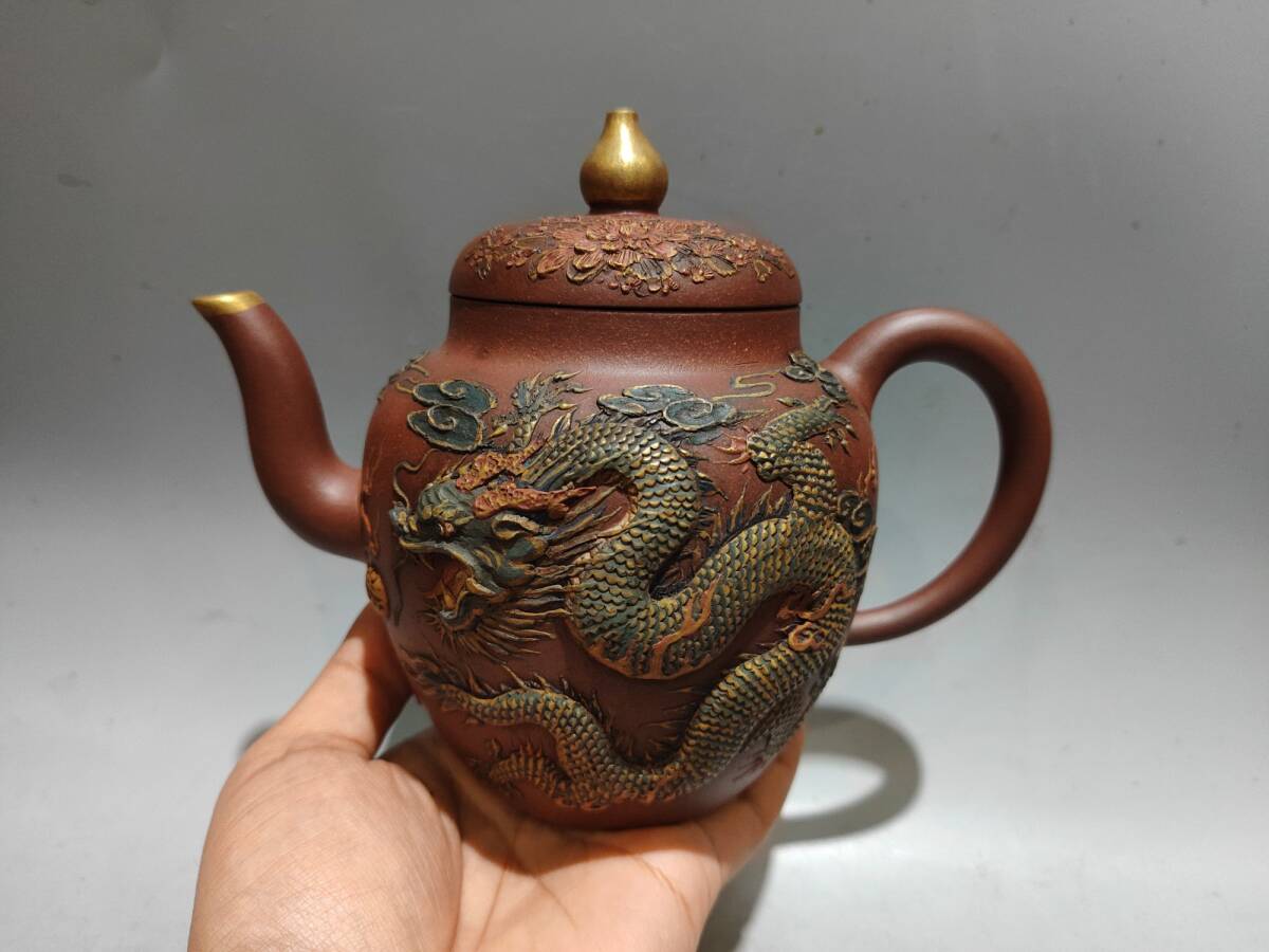 > 【仁】『紫砂壺・塗金・彩繪・龍鳳呈祥壺・大清乾隆年製款・紅泥・茶壺・茶具・茶道品』極細工 古賞物 中国古玩 古美術 古美味