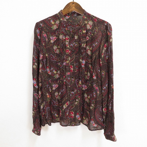 - #a レリアン Leilian シャツ ブラウス 長袖 11号 茶 マルチ 花柄 ペイズリー柄 シルク混 絹混 フリル バンドカラー 日本製 921351 k01