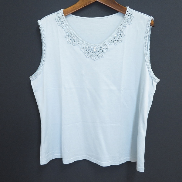 > #s レリアン Leilian ノースリーブ カットソー 13+ 大きいサイズ 水色 タンクトップ かぎ編み ビーズ 綿 コットン 13号 日本製 936392 k01