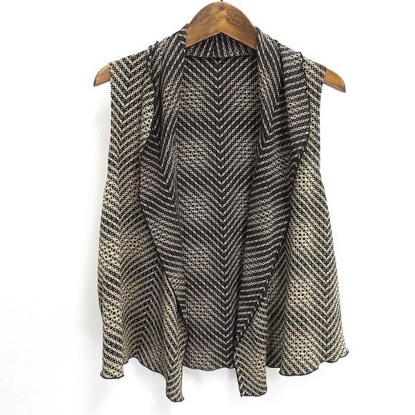 - #a シセンドウ 詩仙堂 ベスト ジレ 黒 ベージュ 総柄 和柄 和風 ちりめん 縮緬 ショールカラー 日本製 美品 レディース [949695] k01