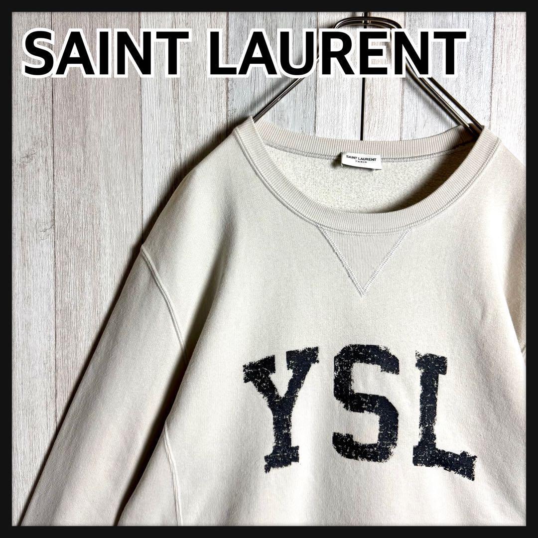 > 【人気デザイン・美品】イタリア製 SAINT LAURENT サンローラン YSL ビッグセンターロゴ スウェット トレーナー サンドベージュ M 大きめ