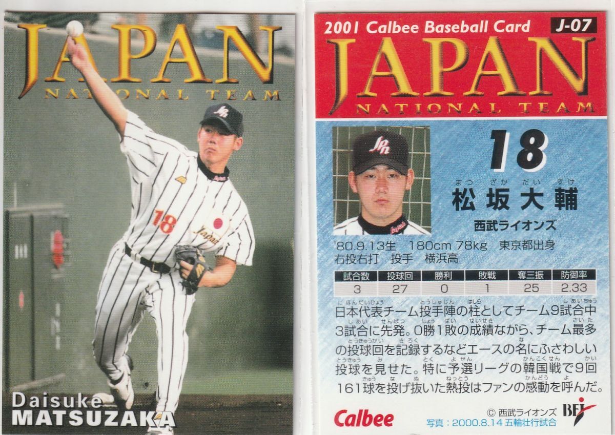 - ●2001カルビー【松坂 大輔】サブ版:日本代表チーム No.J-07:西武 R2