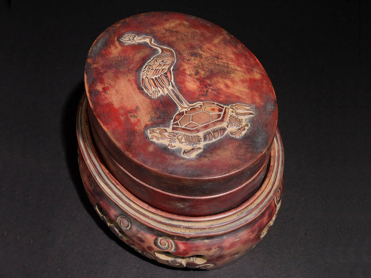 - ▽鴻▽清時代 王傑銘 紅絲石彫 亀鶴斉齢紋硯 蓋硯 唐硯 墨寶 書道具 時代物 中国古美術 骨董品