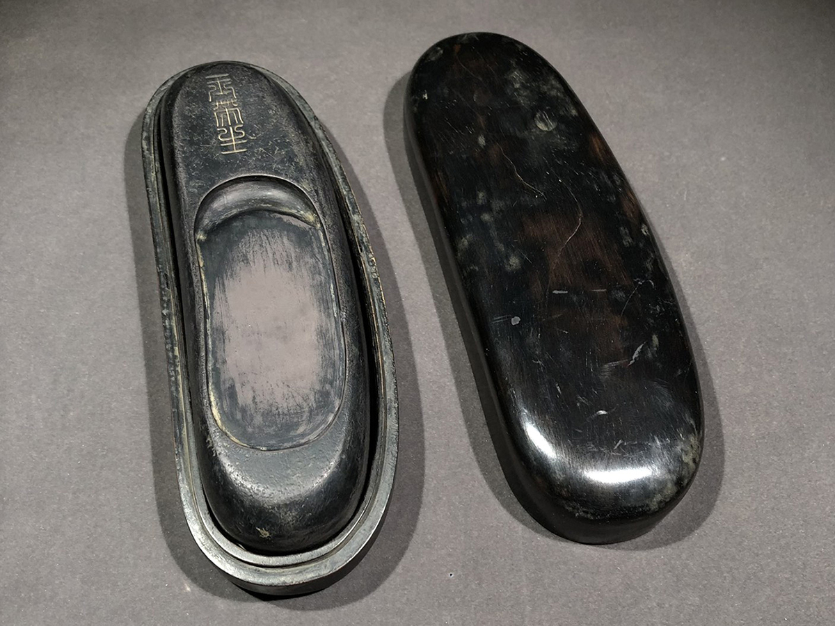 - ▽鴻▽清時代 杜浚銘 玉帯石彫 半月形硯 蓋硯 唐木合 唐硯 墨寶 書道具 時代物 中国古美術 骨董品