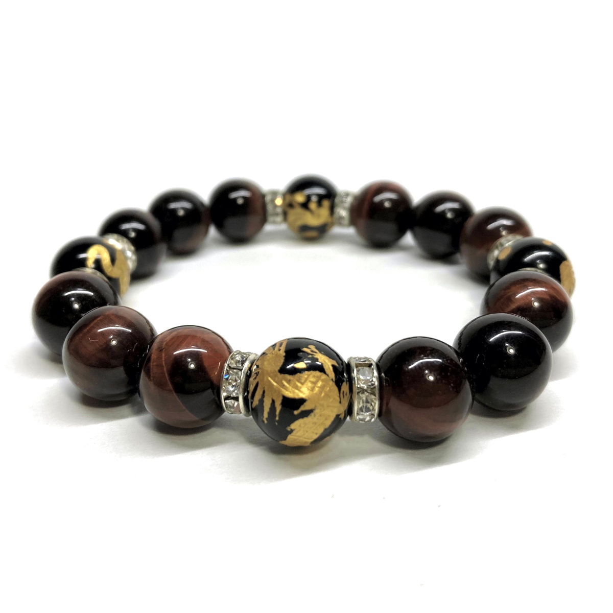 - 四神獣金彫オニキス×レッドタイガーアイ 12mm パワーストーン ブレスレット 天然石 青龍 白虎 玄武 朱雀 運気上昇 開運 金運 お守り S