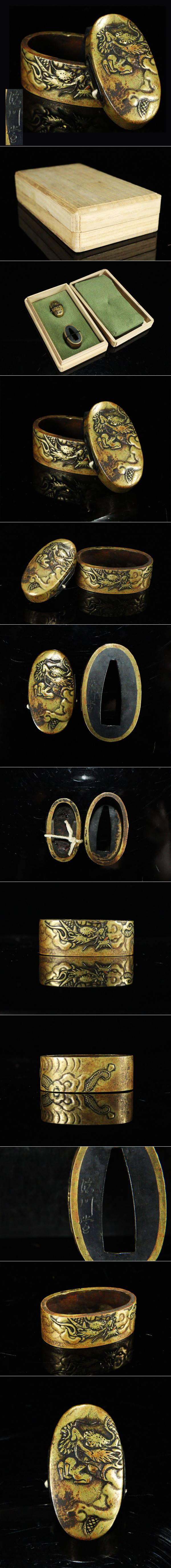 - 【ASAHI】臨川堂光昌在銘(充昌同人) 縁頭「雲龍図」銅地高肉象嵌 金色絵 座布団入桐箱有 江戸中期[7105rp]