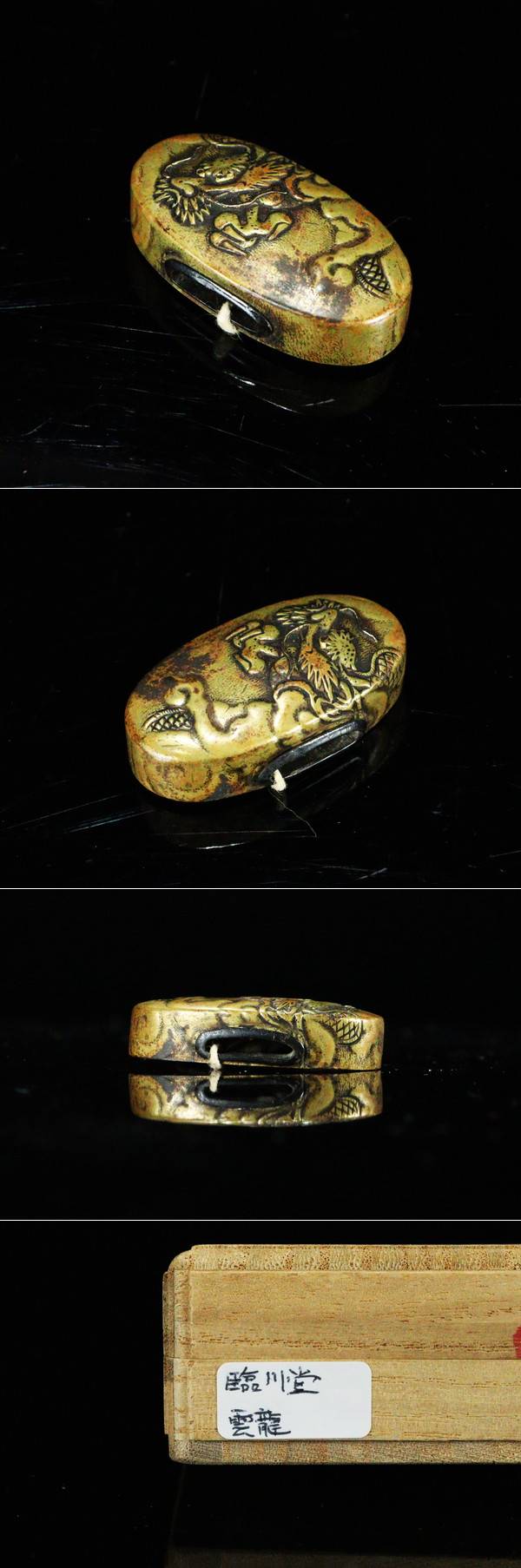 > 【ASAHI】臨川堂光昌在銘(充昌同人) 縁頭「雲龍図」銅地高肉象嵌 金色絵 座布団入桐箱有 江戸中期[7105rp]