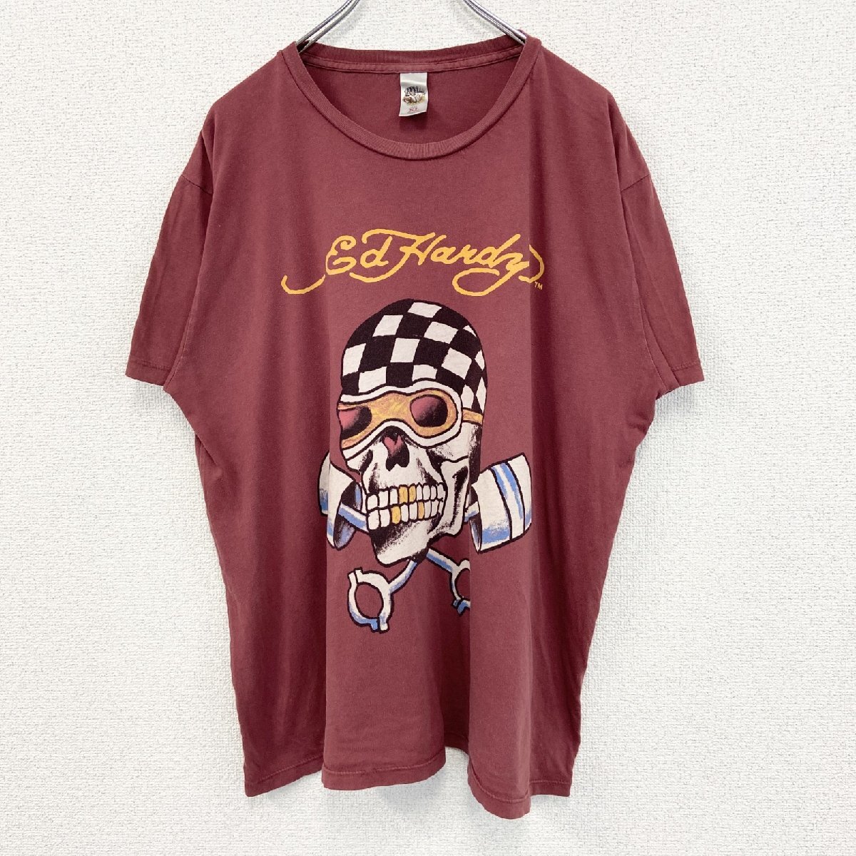 > 古着 used Ed Hardy エドハーディー 半袖プリントTシャツ スカル カジュアルデザイン 赤 クルーネック XLサイズ