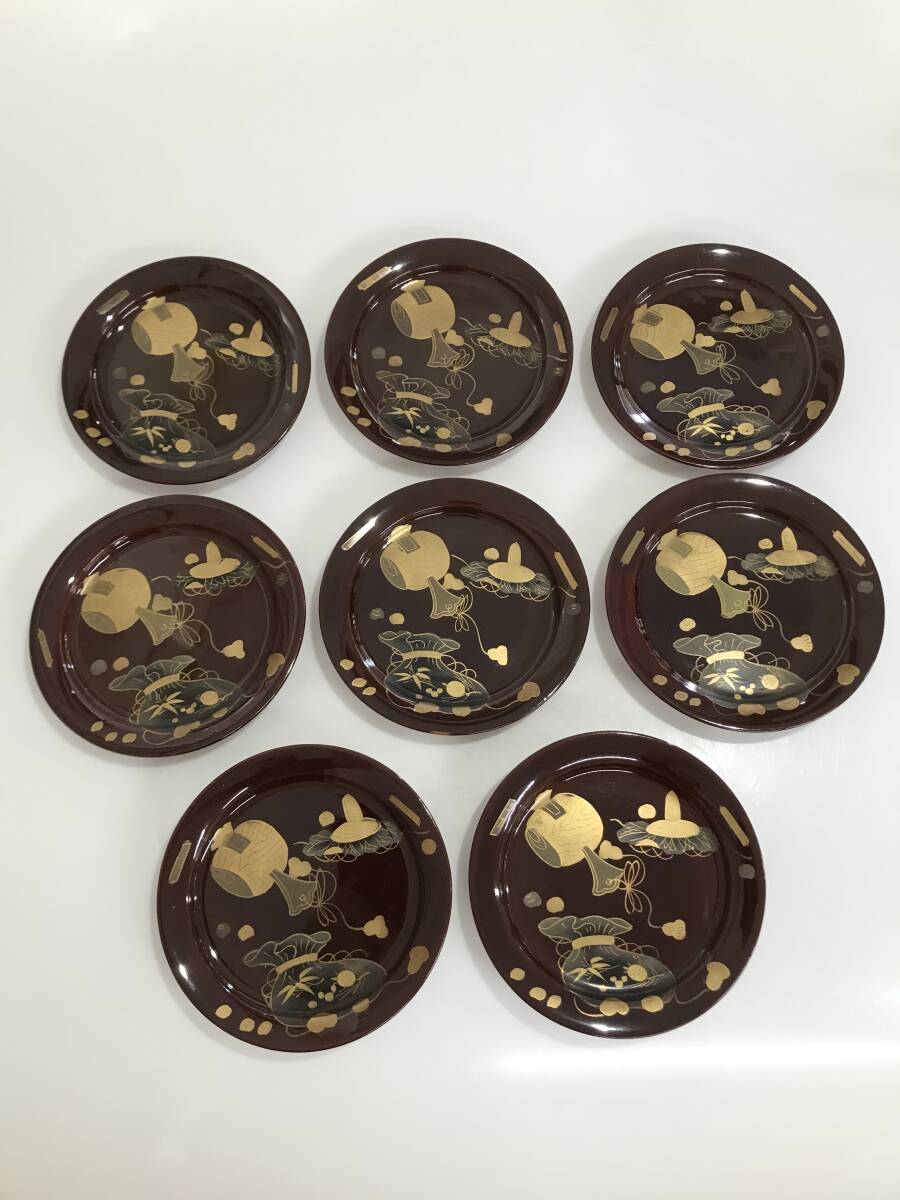 - HG8851 漆塗 金蒔絵 漆器皿 8客 丸型 小槌 寶袋 巾着 帽子 骨董 漆器 漆塗 皿 割烹 料亭 懐石 和食器