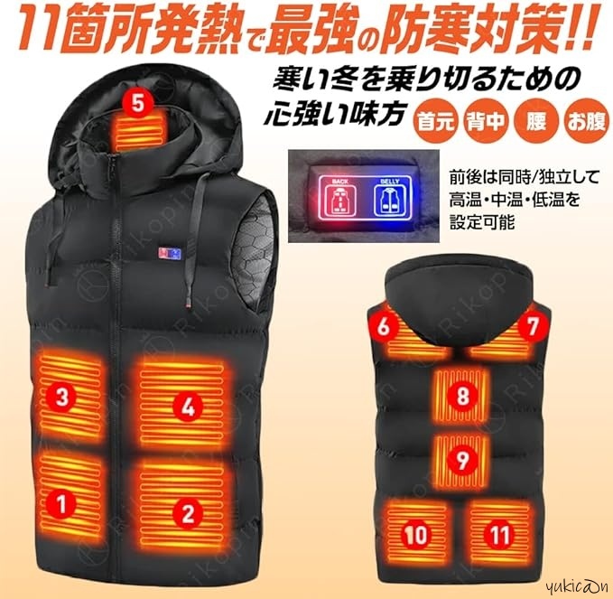 - 加熱ベスト ヒーターベスト ヒートベスト ブラック 2XL 前後11箇所発熱 USB給電 3段階温度調整 速暖 洗濯可 男女兼用 プレゼント