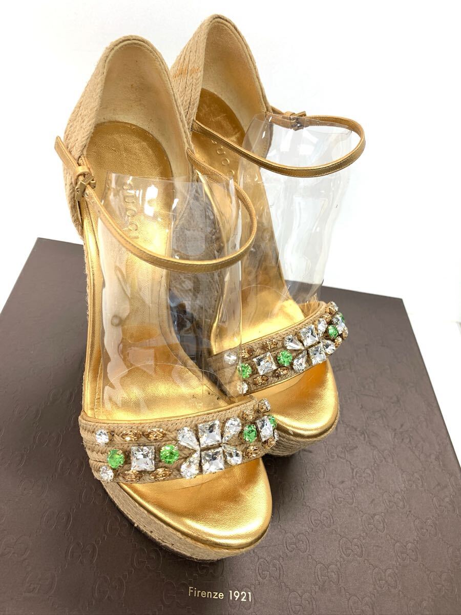 - T10/036 GUCCI グッチ ウェッジソール サンダル ビジュー付 ゴールド