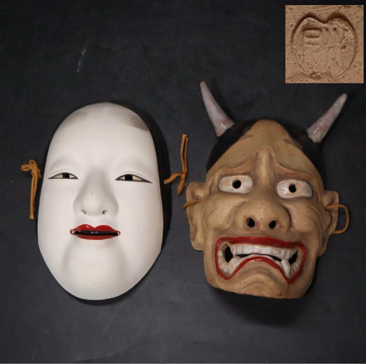 - 希少 水月焼 ・ 砥部焼 細工物 陶器製 能面 2点 ( 般若 ・ 若女 ) / 色絵 飾 .B1270