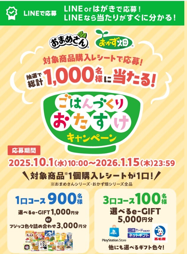 - 懸賞 応募 フジッコ 選べる e-GIFT 5000円分 当たる レシート