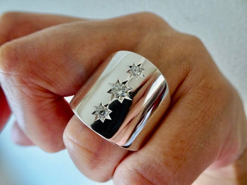 - 仁尾彫金『三つ星ジルコニア、最大幅2.3cm最小幅8mm平打ちリング』ハンドメイド296