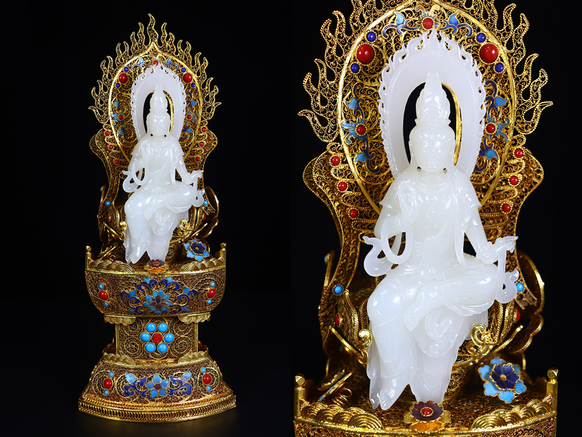 > ▽鴻▽清朝時代 古銅塗金彫 花絲工芸 景泰藍 象嵌和田白玉観音仏像 乾隆御製 時代木箱付き 時代物 中国古美術 骨董品
