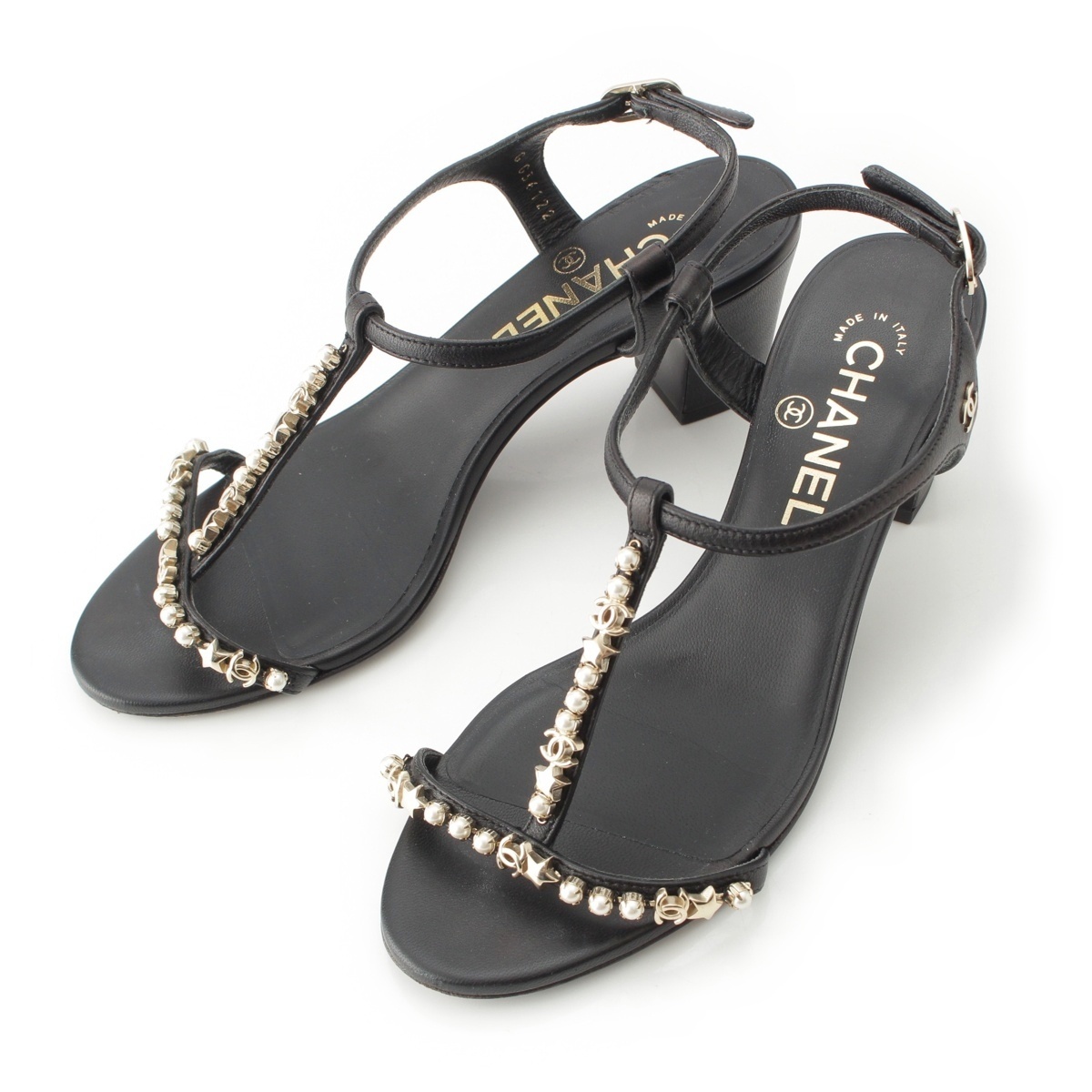 > シャネル レザー ココマーク パール スター ストラップ サンダル G36122 ブラック 37C【中古】