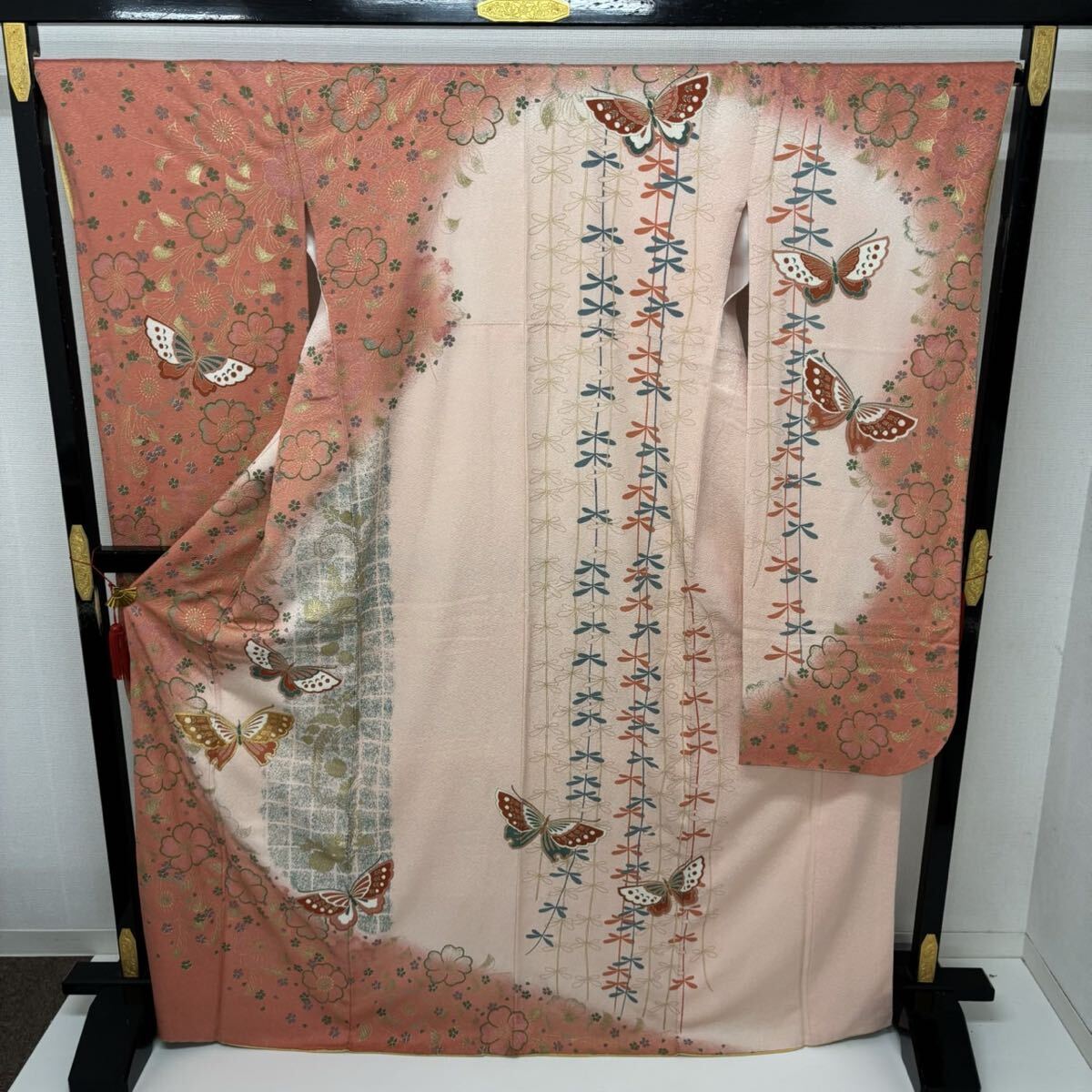 - 振袖 裄68 ちりめん 大胆な蝶の染め 上品な加工 着物 正絹 W-5360