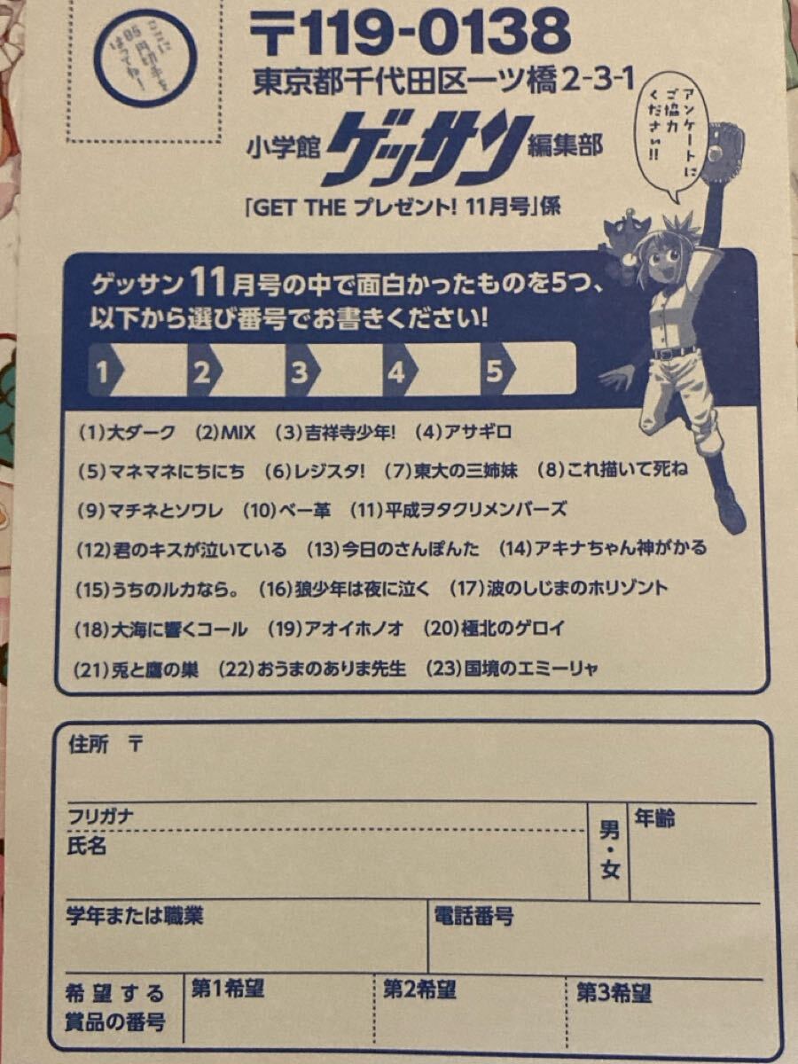 - 3枚まで ゲッサン 11月号 プレゼント応募ハガキ はがき
