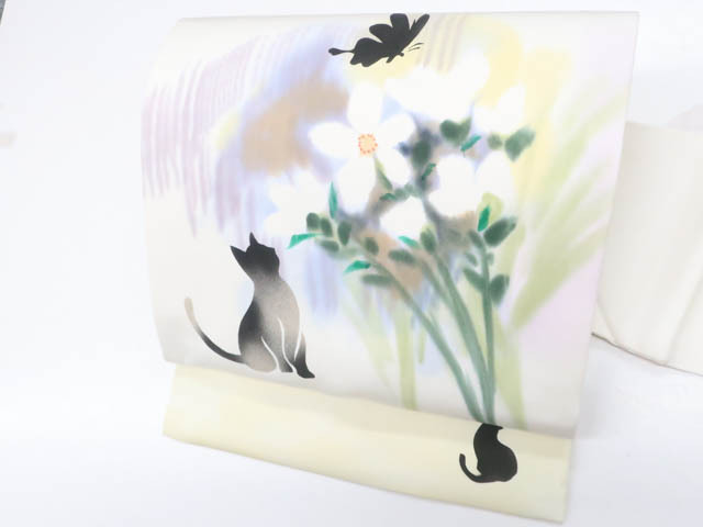 - 《古美術京松》九寸名古屋帯 お太鼓柄 オリジナル 猫 蝶 花 正絹 r7b10-190