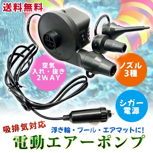 - 送料無料 シガー電源 DC 12V エアーポンプ 電動空気入れ ノズル3種 / シガーソケット 自動空気入れ 浮輪 風船 キッズフロート エアポンプ