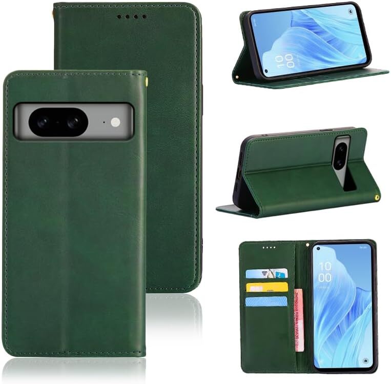 > Google Pixel 8 ケース 手帳型 PUレザー カード収納 財布型 耐衝撃 ケース マグネット スタンド機能付き 濃い緑 ay697