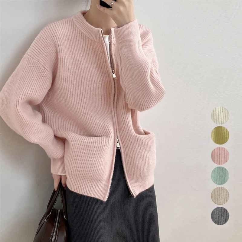 - ニットカーディガン ジップアップアウター ニットウェア レトロ ニットアウター ワンサイズ グレー