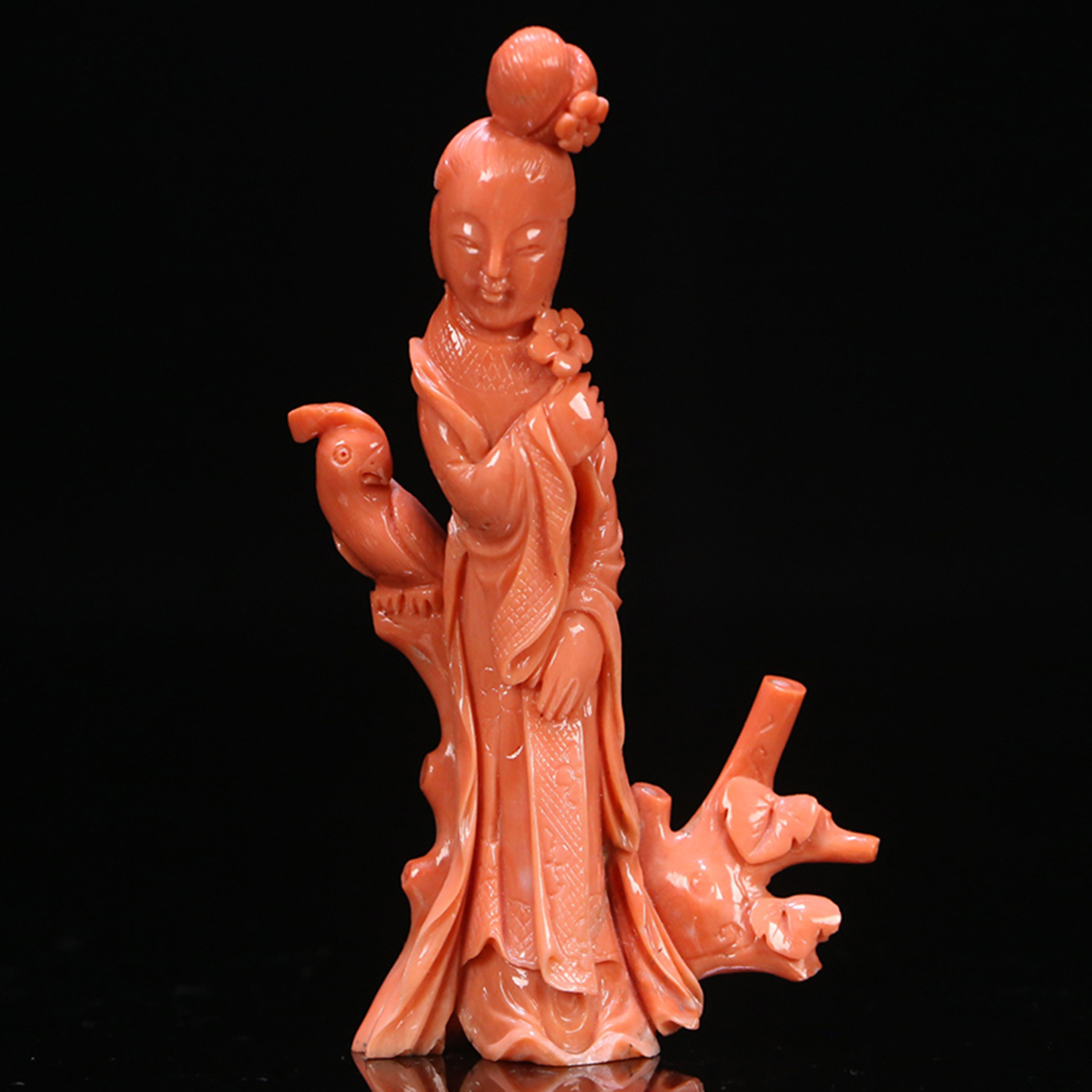 - ▽鴻▽清時代 天然珊瑚 サンゴ オウム仕女置物 時代物 中国古美術 骨董品