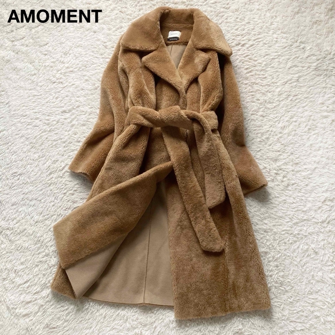 > 美品 AMOMENTO アモーメント 上質 ウール混 テディベアコート ベルテッドコート ロング キャメルベージュ フリーサイズ 3420