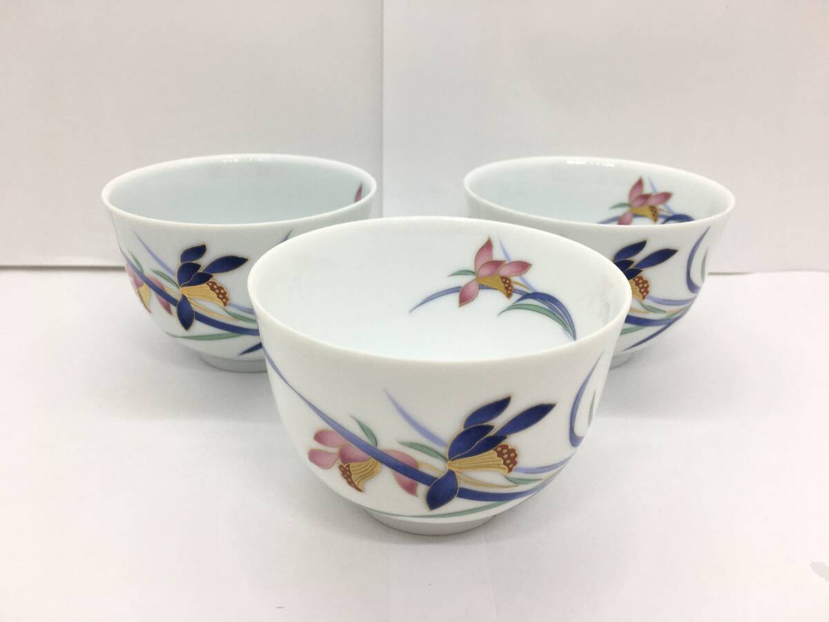 - 湯飲み茶椀 3客 茶器 白×1 薄青×2 花柄 昭和レトロ