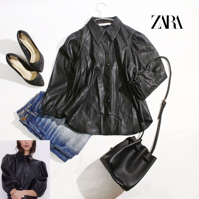 > 美品 ZARA ザラ レザー 秋 合物 パフスリーブ ブラウス フェイクレザー シャツ S ブラック 黒 トップス 羽織 レザーシャツ ハロウィン ロリ