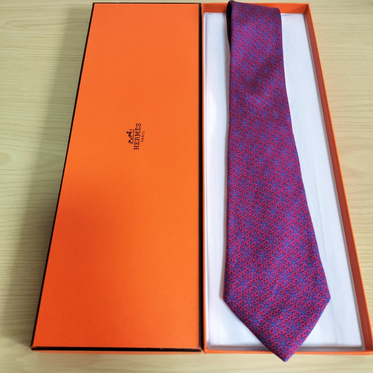- エルメス(HERMES)青赤ミニチェーン丸模様ネクタイ