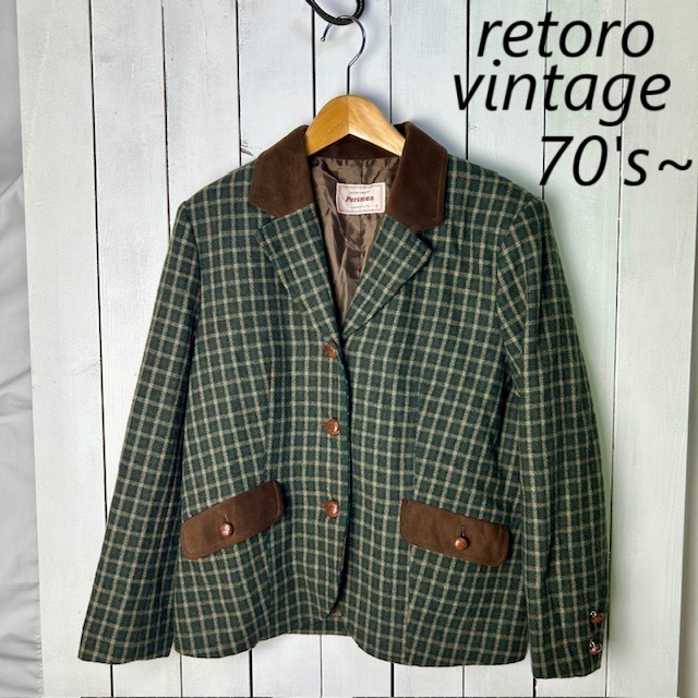 > 昭和レトロ 70s~80s チェック切替え ウールテーラードジャケット 9A オールド ヴィンテージ 緑×茶 秋冬 国産 カントリー 胡桃ボタン●176