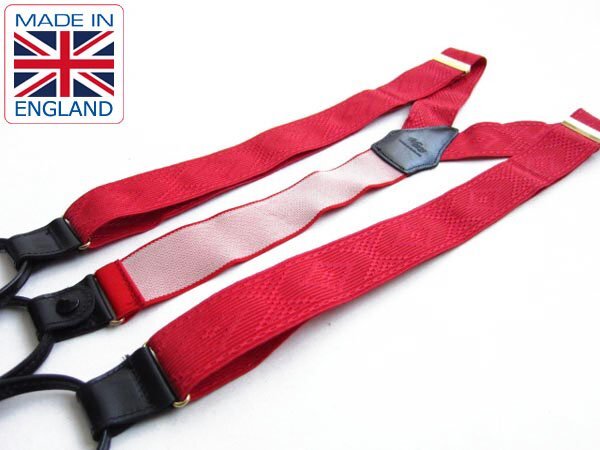 > 英国製/CAS GERMANY×Albany/伸縮素材×レザー/ボタンタブ式/Y型 サスペンダー/赤系【メンズXL】Yバック/長いサイズ/D79