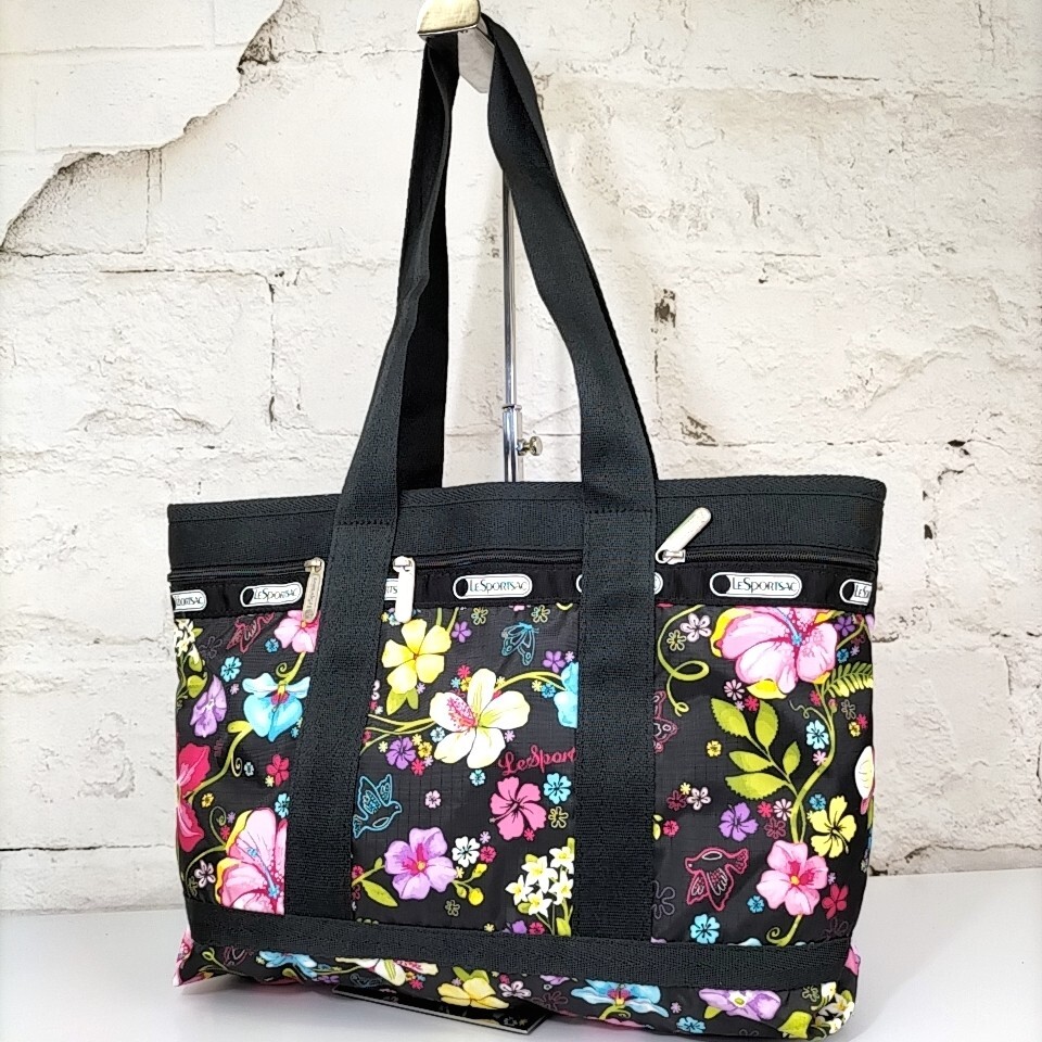 - 【 LeSportsac 】 レスポートサック 花 総柄 ナイロン セミショルダー 肩掛け トートバッグ レディースバッグ 黒 ブラック G